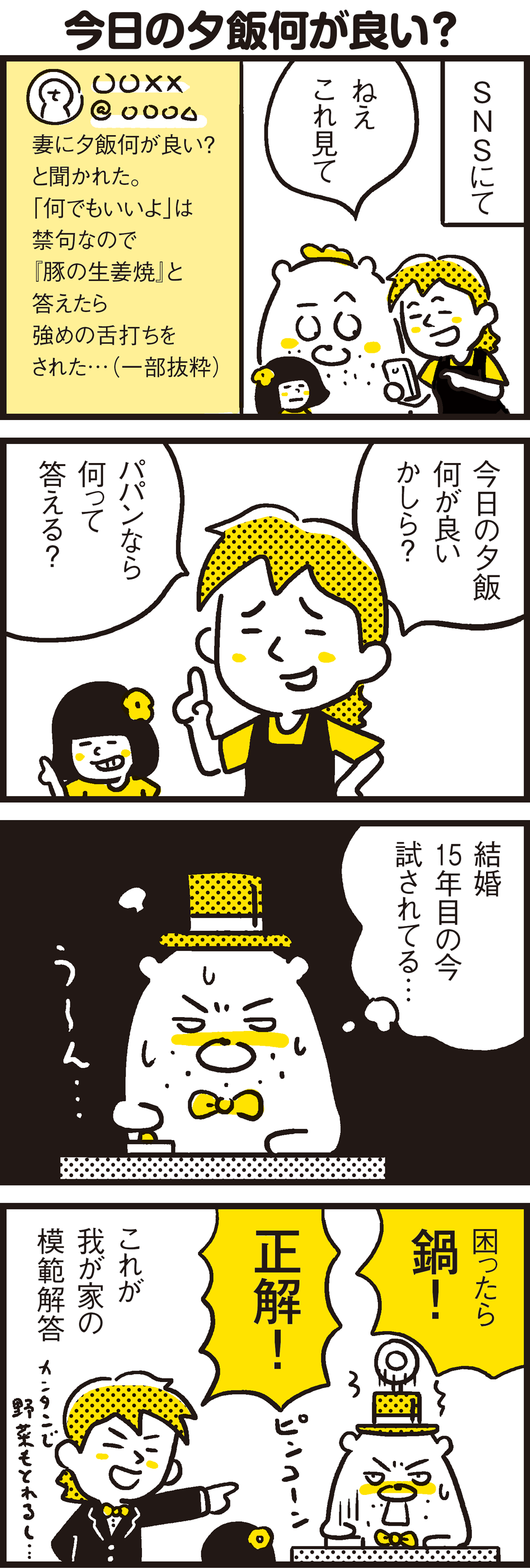 2020年06月13日 今夜の夕飯何が良い?と聞かれた時の我が家の模範解答とは? 育児マンガでスタートした当ブログは、ママンの乳がん闘病を乗り越え、現在おてんば娘編に突入。育児・暮らし・乳がん闘病をテーマに時におかしく時に真面目に日々描いてます!先日SNSのニュースで話題なっていたので漫画にしてみました。今夜の夕飯を聞かれた時の回答は、外食するとか、旦那が作るというのも答えになるのでしょうが、我が家の回答は「鍋」。鍋って野菜も摂れるし、簡単だし、何よりアレンジで色んな味に変わるので我が家の場合 重宝されます。皆さんのご家庭での答えは何でしたか?▼CLICK!▼こんなお話も一緒にどうぞ↓ ▼その他 グルメ・フードに関する話もどうぞ ▼絶賛発売中!コミックエッセイ ちびといつまでも-ママの乳がんとパパのお弁当と桜の季節-▼クリック応援宜しくね!▼ 「おてんば娘編」カテゴリの最新記事 タグ :#鍋#献立#今夜のメニュー#夕飯#クイズ#悩み < 前の記事次の記事 > コメント コメント一覧 (3) 1. まふゆ 2020年06月13日 21:40 確かに切って煮込んでたくさん食べられる鍋最強w 今度コロナが落ち着いたらパパンさんファミリーと読者で持ち込み鍋パをw 0 柏原昇店 店主 がしました 2. 楽嬉 2020年06月13日 21:54 お鍋いいですねー! 確かに何でもいいどう言われたら、困りますね! 私は最近運動ストレッチをYouTube見ながら、 頑張っています。 7キロ体重落とさないと(^^) いい汗かいて気持ちいいですよ^ ^ 0 柏原昇店 店主 がしました 3. がのの 2020年06月14日 00:18 だいぶ前、チビに何がいいか尋ねたら「なんでもいい」と答えられたので じゃあお母さんの大好きな激辛カレーにするね♪と言ったら それきっかけでなんでもいいを言わなくなりました(笑) 最近は冷蔵庫の中身を伝えつつ、◇◇があるなら※※がいい!みたいな、 家にあるもので要望を言ってくれることもある優秀な子に(笑) こっちからいくつか選択肢を与えつつ、チビの要望も聞きつつ メニューに困ったときはいつもそうしています。 旦那は基本的に子供優先に考えてくれているので意見が分かれることもなく。 本当にありがたいです。 お鍋か~。 さすが15年の付き合い!模範解答が完璧ですね(笑) 5コマ目のママンさんの鼻が心なしか高く見えます(笑) 0 柏原昇店 店主 がしました コメントフォーム 名前 コメント 記事の評価 リセット リセット 顔 星 情報を記憶 コメントを投稿する